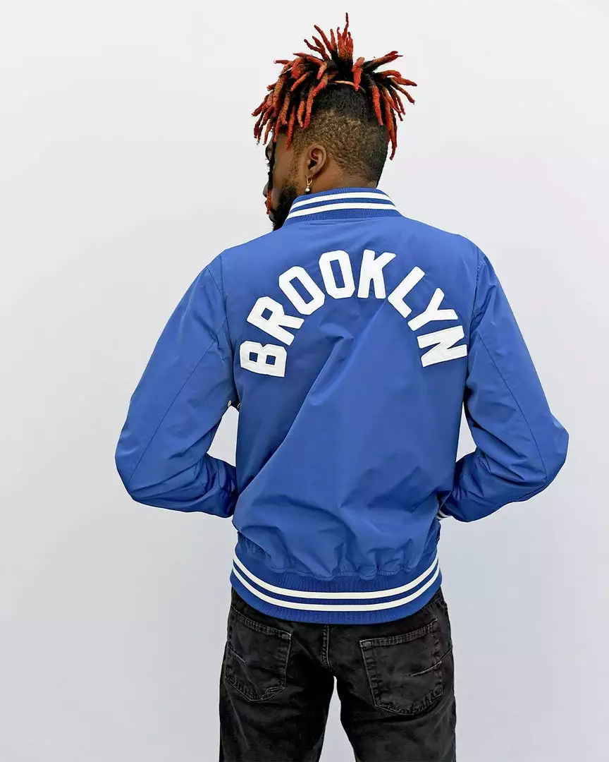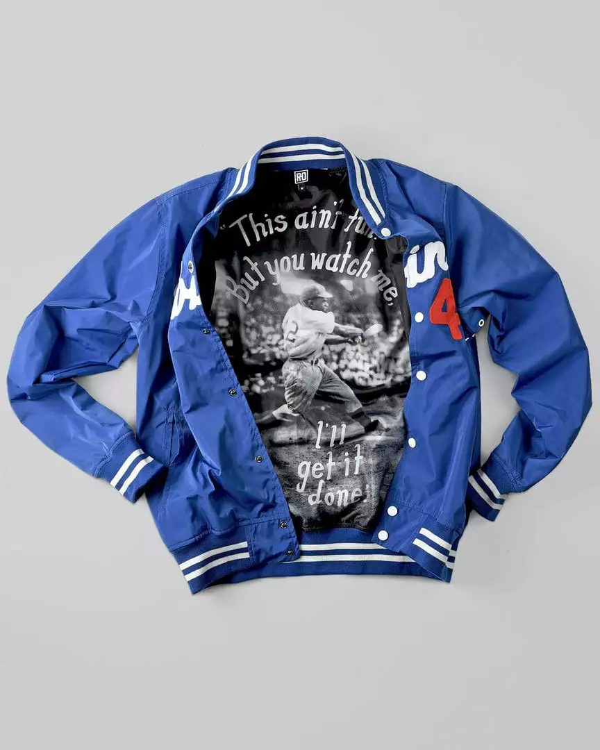 Marquee players. Bigtime names. Electric threads in the roots of history. Constructed with plain weave fabric, these jackets are 100 percent polyester with a slick, water repellent exterior that shines under the lights. Featuring 1 x 1 ribbing on the collar, cuffs, and hems and double welt pockets, a snap front enclosure, and metal eyelets, the graphic inner linings tell a personal story of each icon.