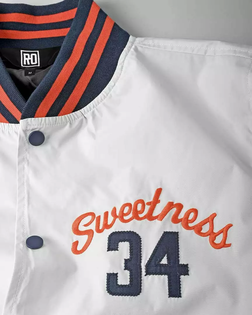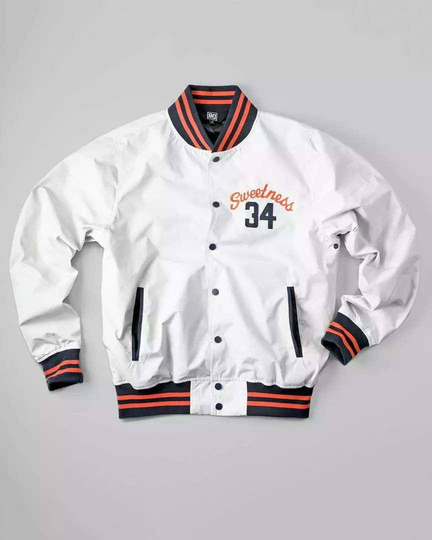 Marquee players. Bigtime names. Electric threads in the roots of history. Constructed with plain weave fabric, these jackets are 100 percent polyester with a slick, water repellent exterior that shines under the lights. Featuring 1 x 1 ribbing on the collar, cuffs, and hems and double welt pockets, a snap front enclosure, and metal eyelets, the graphic inner linings tell a personal story of each icon.